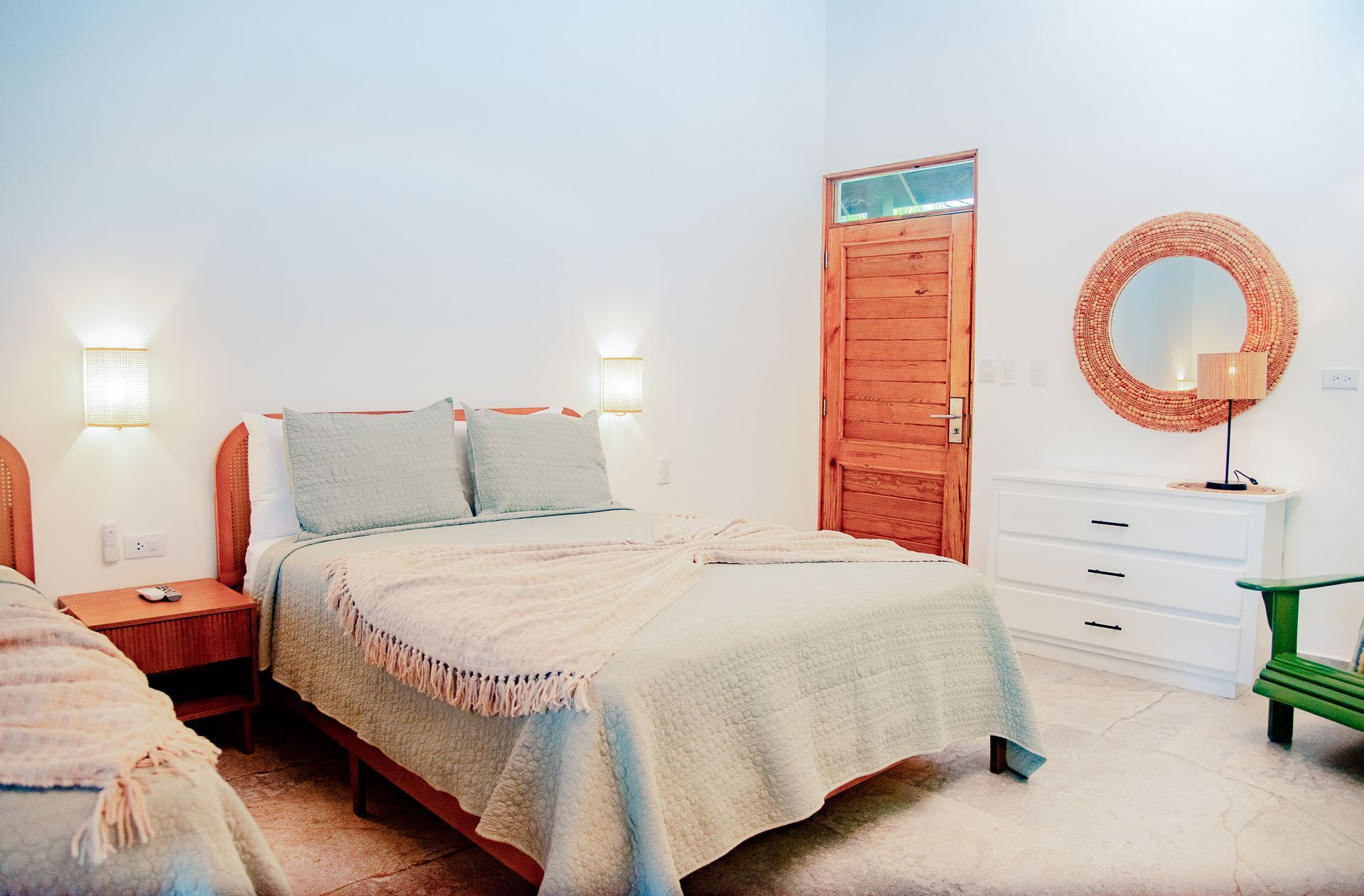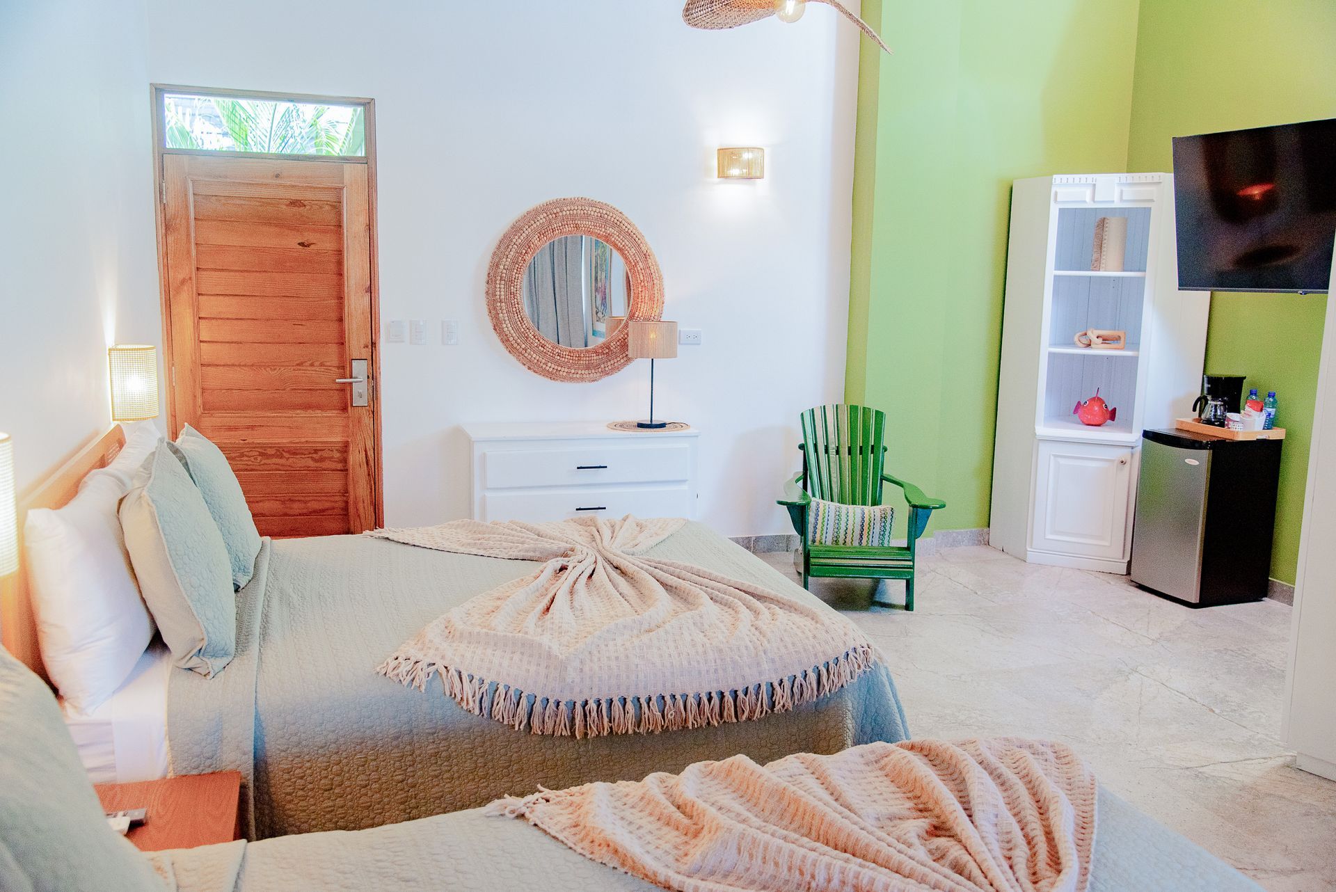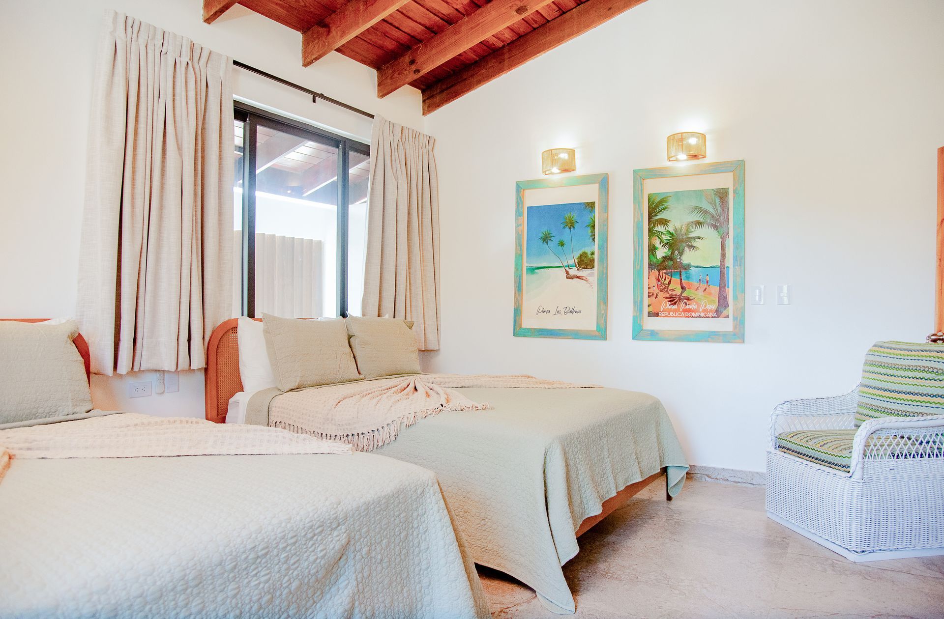 Our Superior Family Room is designed for those seeking premium comfort and boutique style in the heart of Las Galeras, Samaná. Equipped with two Queen-size beds, a modern full size bathroom, a seating area with armchairs, and ample closet space, private modern bathroom, air conditioning, flat-screen TV, free Wi-Fi, mini-fridge, a coffee station and a safe. This room features a large entry way with ample closet space to have your luggage out of the way. The ideal place to re charge after a day exploring Las Galeras, perfect for couples or families traveling with children ensuring you a pleasant stay from beginning to end.